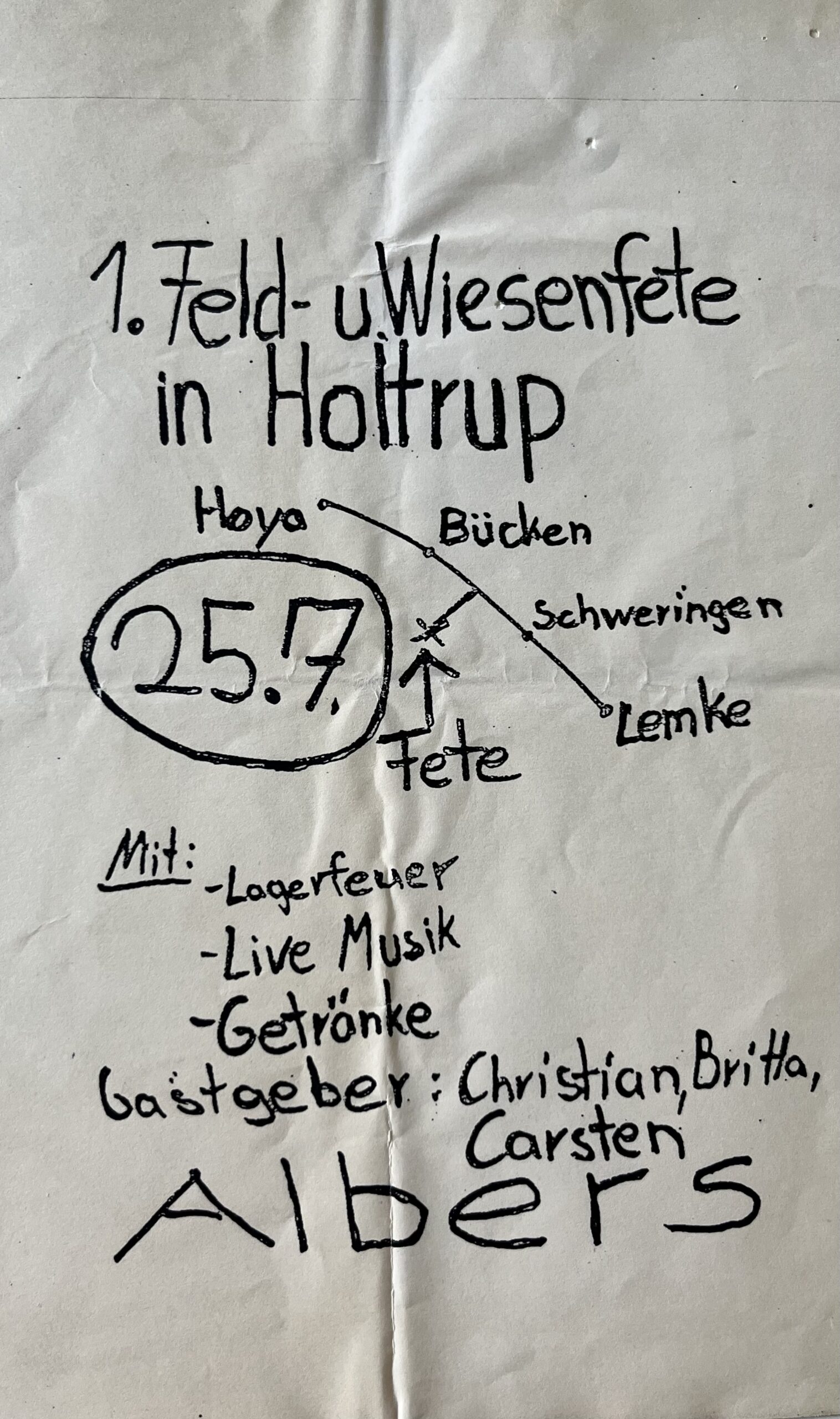 Ein kopierter A5 Zettel machte Ende Juni 1992 die Runde: „1. Feld- und Wiesenfete in Holtrup“. Was als etwas größere Geburtstagsparty dreier Geschwister gedacht war, wurde über die folgenden Jahre zu einer regionalkulturell festen Instanz gleich nach dem Brokser Markt. Im ersten Jahr mussten die beiden vorgesehenen Bands noch angefleht werden, doch bitte aufzutreten- in den weiteren Jahren riefen Musiker bereits ab Januar in Holtrup an und baten, spielen zu dürfen. Christian wurde wegen solch dringender Anrufe mehrfach extra vom Trecker geholt- Kühe versorgen ist schließlich Nebensache, wenn die Aussicht auf den Grammy ruft.