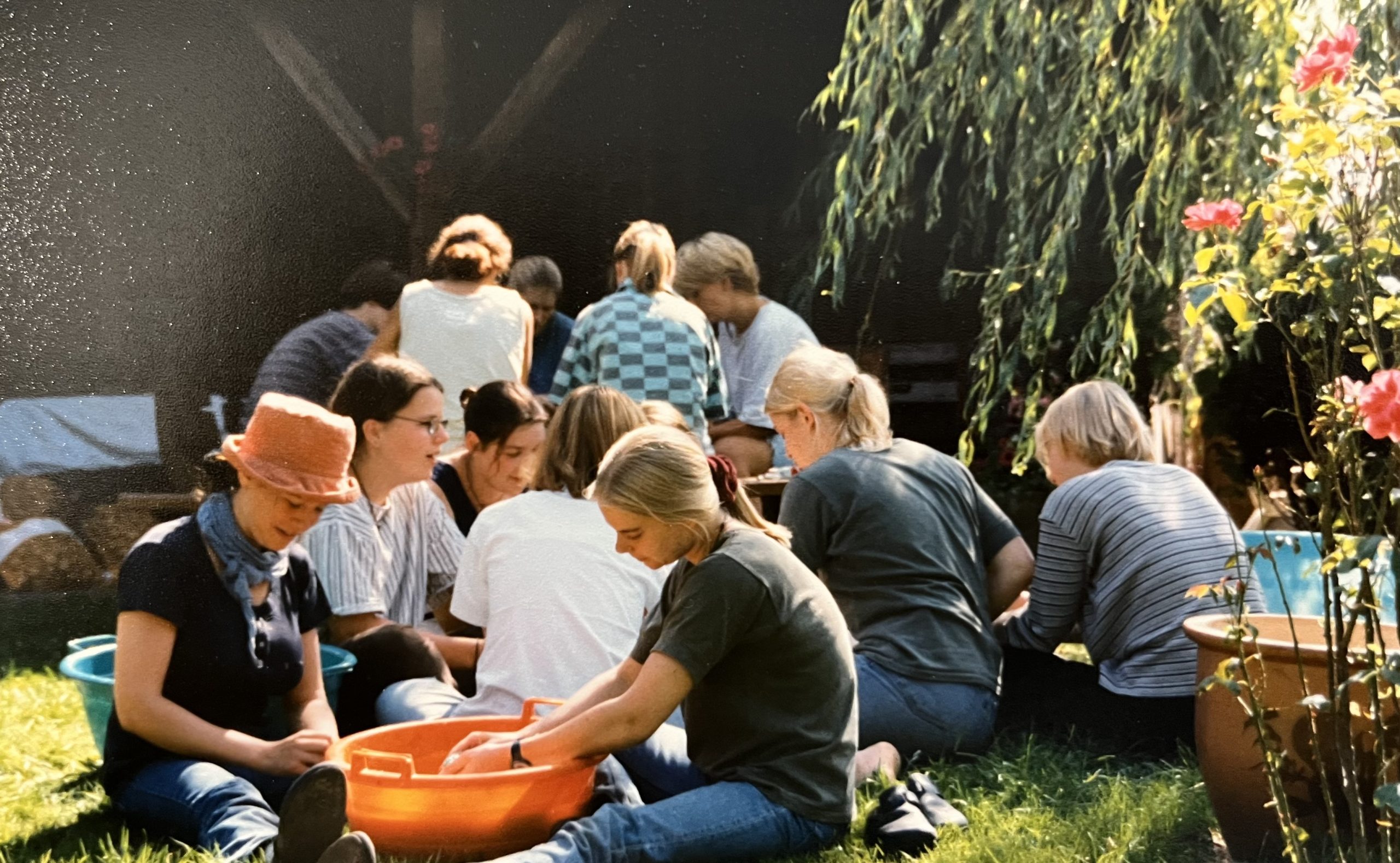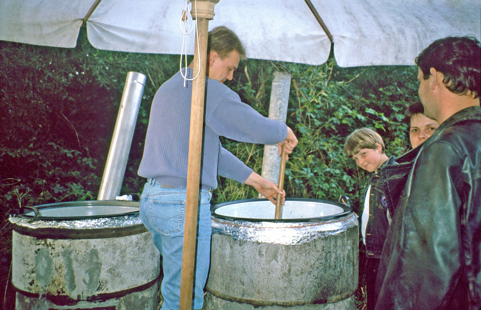 „Lagerfeuer, Live Musik, Getränke“…als umsonst und „all inclusive“ verstand sich die Fete damals. Die Besucherzahl stieg rasch. Was nicht auf dem Flyer stand, war zum Beispiel die legendäre Kartoffelsuppe, die in drei alten Waschkesseln vor Ort überm Feuer gekocht wurde. Vegan? Glutenfrei? …wohl eher nicht- dafür äußerst kommunikativ: Stundenlang schälten viele Freiwillige bereits am Vortag Kartoffeln- irgendwie wars auch immer eine Art Pre-Party. Die fertige Suppe wurde gratis von äußerst hilfsbereiten und sturmerprobten Frauen aus Holtrup verteilt („Schweine füttern ist harmlos dagegen!“).